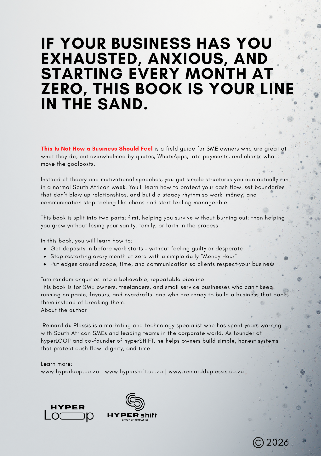 This book is written for South African SME owners who are in the fight every day – especially service businesses and professional services: agencies, consultants, trades, coaches, creatives, small firms. If you're signing your own payslip, juggling clients, and carrying the weight of staff and family on your shoulders, this is for you. You don't need an MBA. You need straight talk, practical structure, and examples that feel like your world, not a Silicon Valley case study.